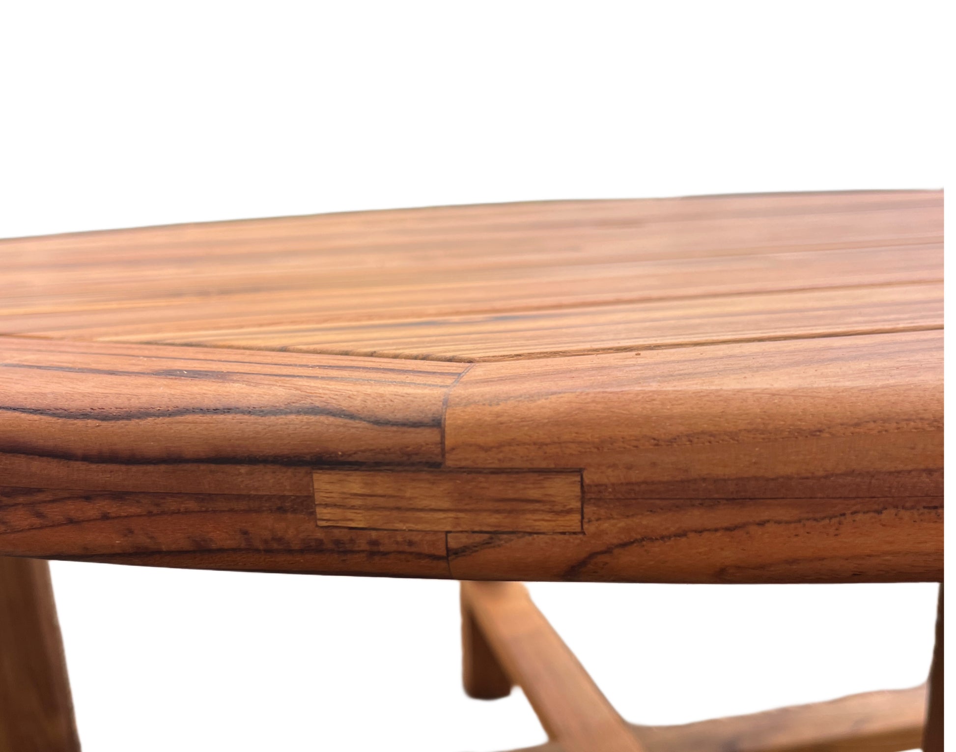 A handcrafted round outdoor dining table built from solid hardwood and designed for lasting outdoor durability. The top features a clean slatted pattern framed by a solid perimeter, supported by sturdy legs and cross bracing for strength and stability. Traditional joinery and careful craftsmanship ensure a table that is both beautiful and built to endure the elements.